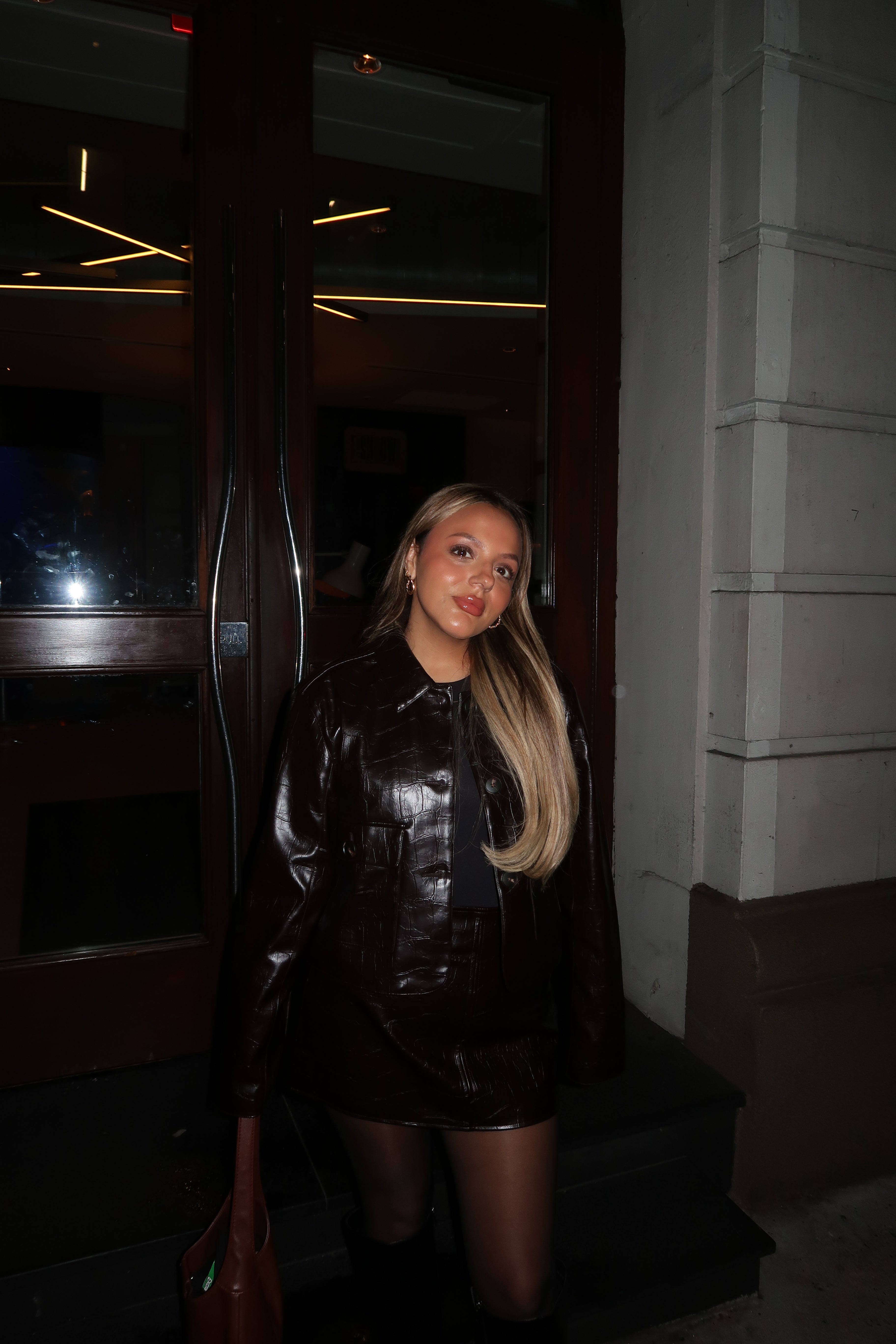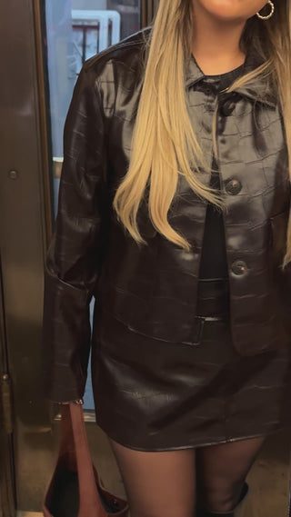 Elevate your wardrobe with the Tatianna Skirt, crafted from rich burgundy leather for a bold, sophisticated look. Its sleek silhouette is enhanced by stylish fake front pocket details, adding an edgy touch without bulk. Perfect for turning heads whether dressed up or down, this skirt combines modern design with timeless appeal for effortless confidence every time you wear it.