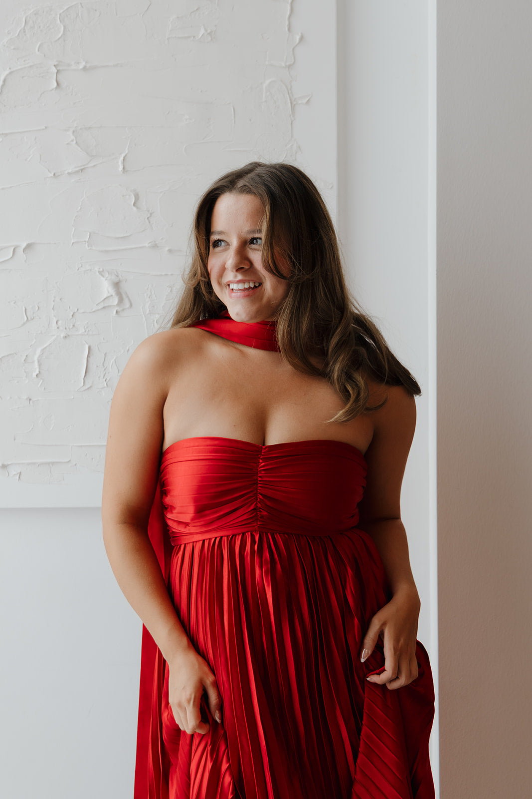 Elevate your evening wardrobe with the Aster Dress, a stunning red satin maxi designed to captivate. Its delicate pleats flow gracefully, creating an elegant silhouette that moves with you. The matching scarf adds a versatile touch, perfect for styling as a shawl or accessory. Ideal for special occasions, this dress combines luxe fabric and timeless design to make you feel confident and radiant.