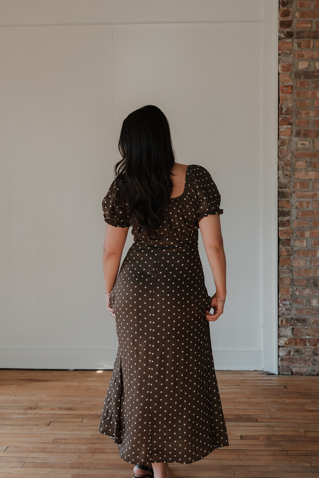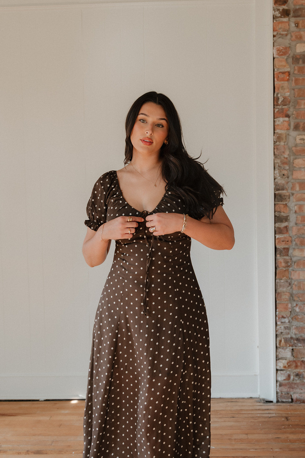Woven Rayon Polyester Polka Dot Print V-Neck Short Sleeve Flare Long Dress with Front Tie Strap and Rayon Lining