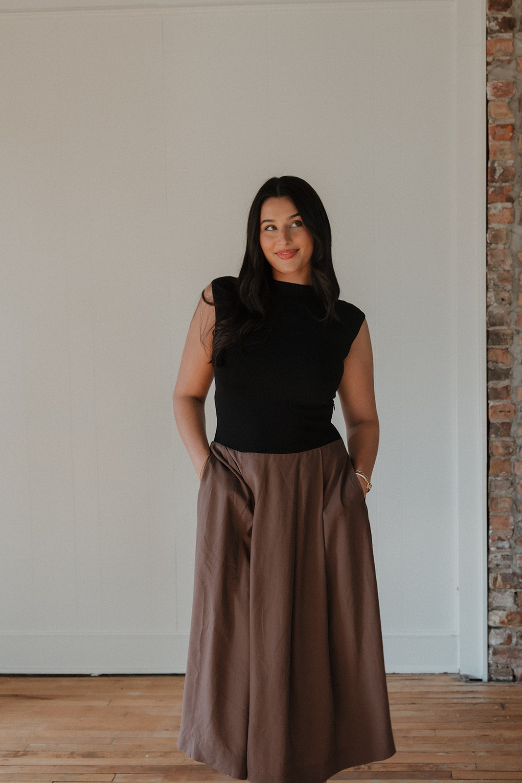 Elevate your style with the Cairo Dress, featuring a sophisticated black and brown color palette. Its high neck and drop waist design create a flattering silhouette that balances elegance with modern flair. Perfect for any occasion, this dress combines comfort and chic, making it an effortless choice to stand out and feel confident all day or night.