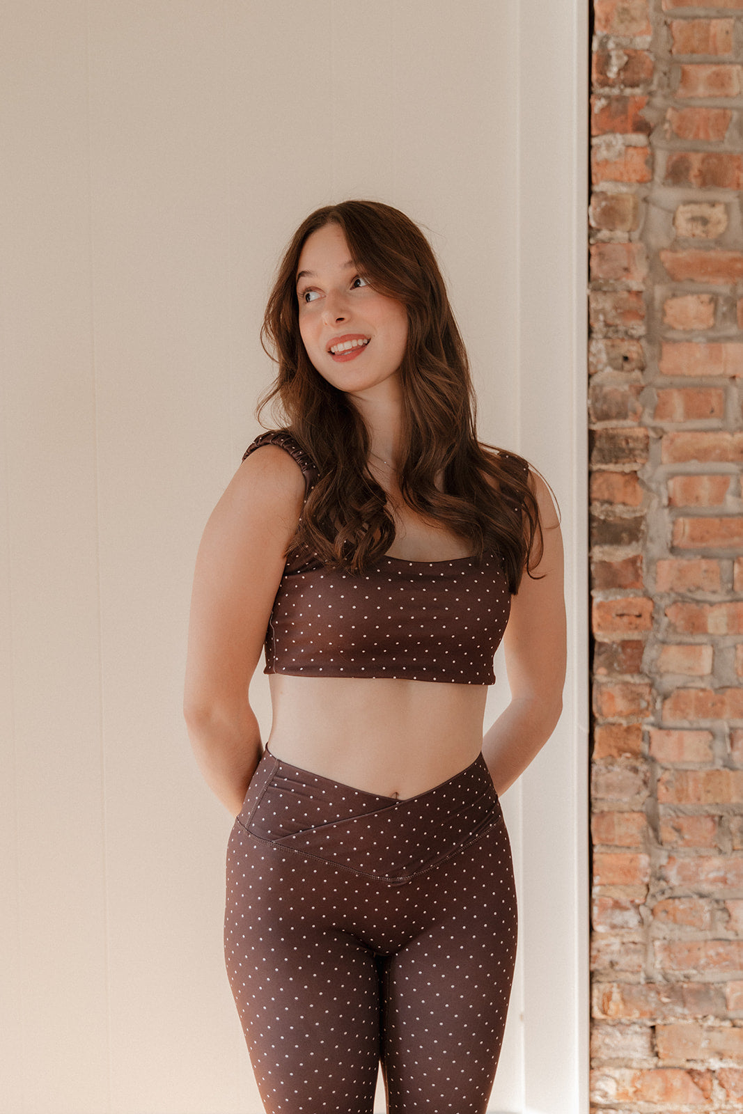 Elevate your activewear with the Sofia Leggings, featuring a stylish brown polka dot crossover design. Crafted for comfort and flexibility, these leggings move seamlessly with you, whether at the gym or running errands. Their flattering crossover waistband provides support and a chic touch, making them a versatile staple for your everyday wardrobe.