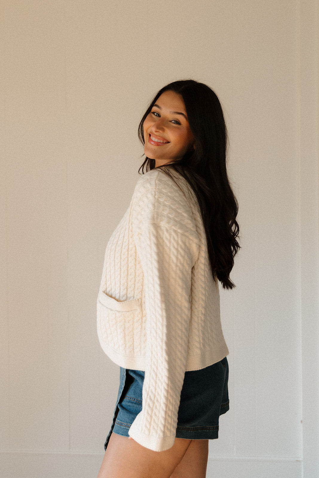 The Genevieve Cardigan combines cozy softness with elegant design. Crafted from a super soft white cable knit, it features a flattering rounded hem that adds a subtle feminine touch. Gold detailed buttons bring a refined finish, making this cardigan perfect for layering in style and comfort. Ideal for dressing up or down, it promises warmth without sacrificing sophistication.