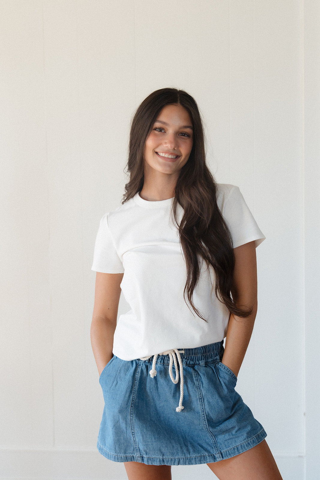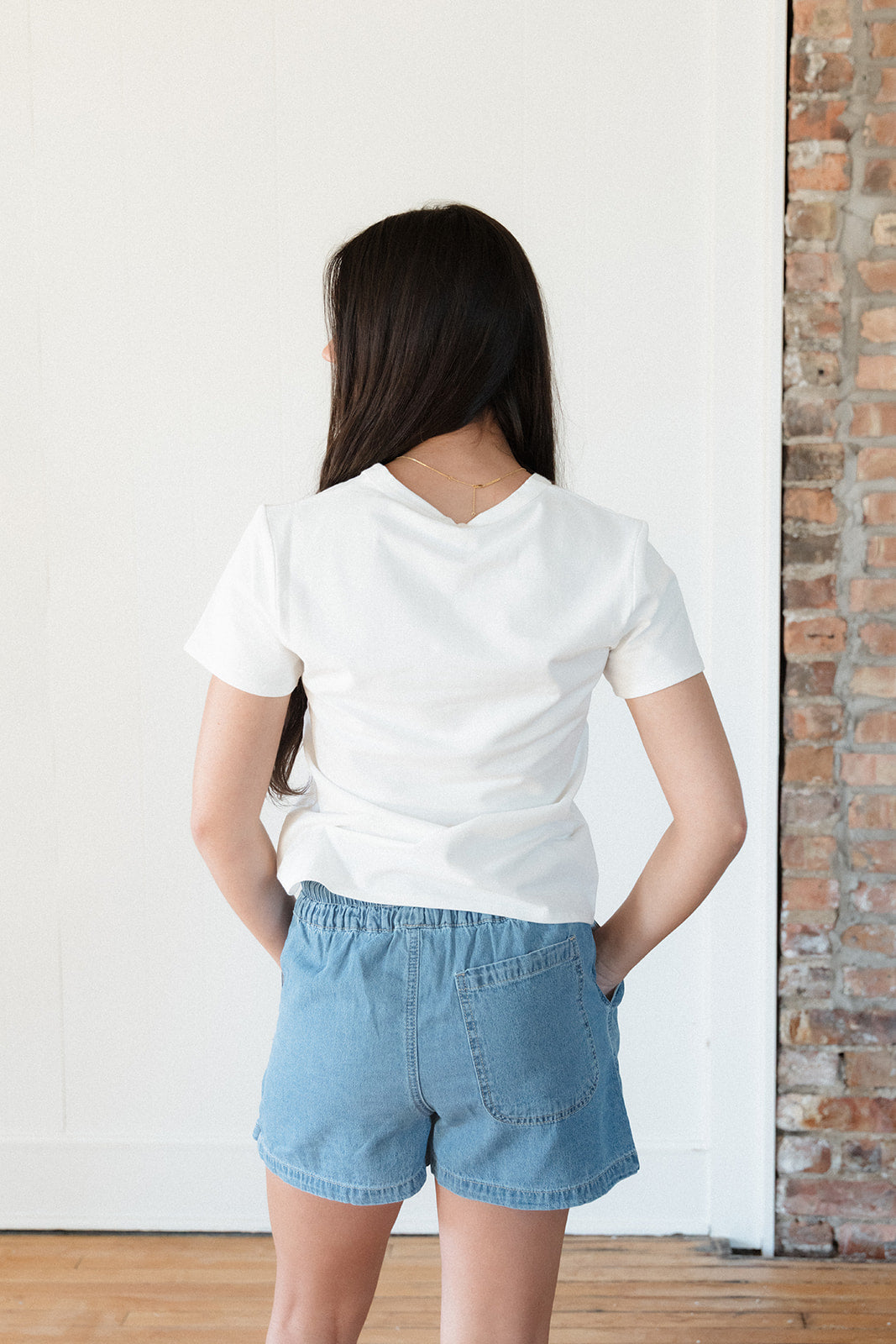 These vintage-inspired denim skorts offer the perfect blend of style and practicality. Featuring a wide smocked waistband with an adjustable drawstring, they ensure a comfortable, customizable fit. The high-rise waist and relaxed silhouette create a flattering shape, while the built-in shorts add ease and confidence to your movement. Oversized pouch pockets bring a playful, functional detail, making these skorts an essential addition to your wardrobe for everyday wear.