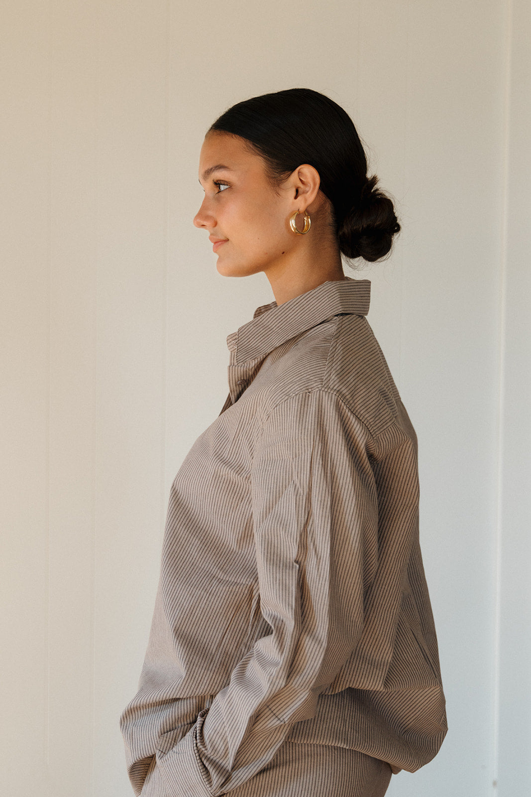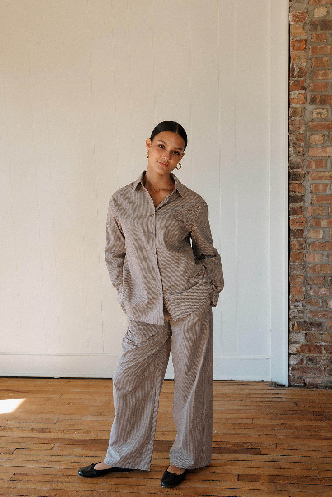 Elevate your everyday style with the Elizabeth Top, a beige striped button-down designed for effortless sophistication. Its classic stripes add subtle texture, while the tailored fit ensures a flattering silhouette. Perfect for both work and weekend, this top brings timeless elegance to your wardrobe with comfortable wearability.