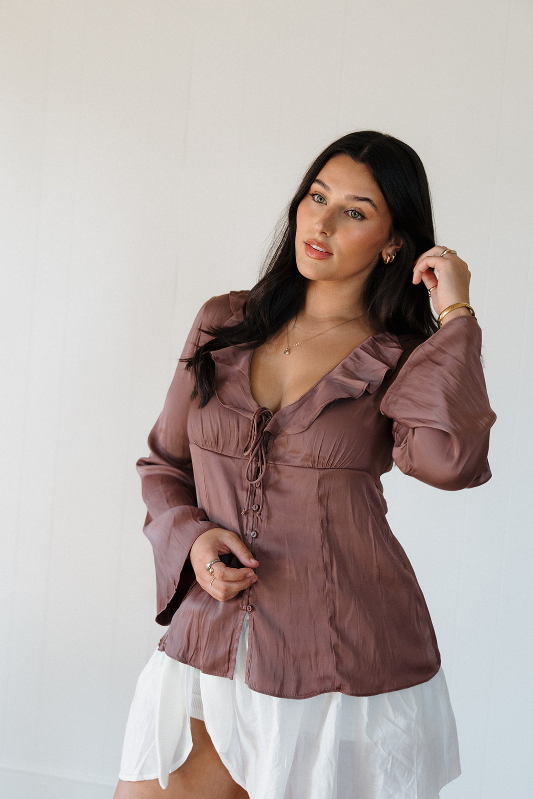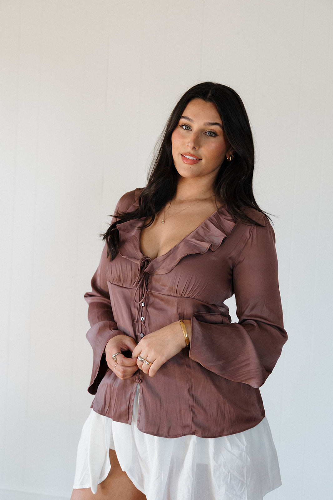 Elevate your wardrobe with the Jaylen Blouse, featuring a rich chocolate hue and delicate rose-inspired ruffles along the button-down front. This blouse combines feminine charm with classic tailoring, making it perfect for both professional settings and elegant outings. The soft fabric ensures comfortable wear, while the intricate ruffled detail adds a stylish focal point that draws attention. Bring a touch of sophistication and warmth to any outfit with this effortlessly chic piece.
